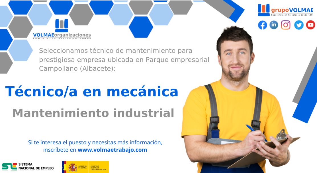 VolmaeORGANIZACIONES selecciona para prestigiosa empresa del sector metal un técnico mecánico con experiencia en mantenimiento industrial.